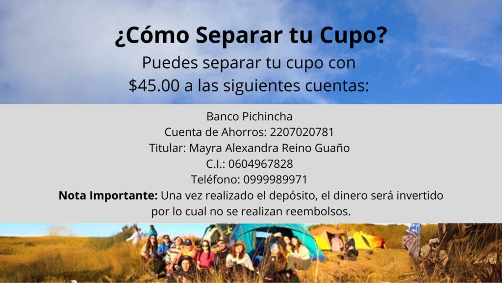 - Mochila cómoda: Donde llevarás tus cosas personales, incluyendo el equipo de camping (carpa, sleeping, aislante) que nosotros te proporcionamos.